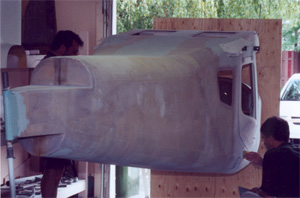 Luc poursuit le travail commencé la semaine dernière sur la pièce du cadre du pare-brise. On ajoute de la putty, on l'étend, utilise une râpe pour enlever le surplus encore frais et on sable et ponce un peu plus tard...